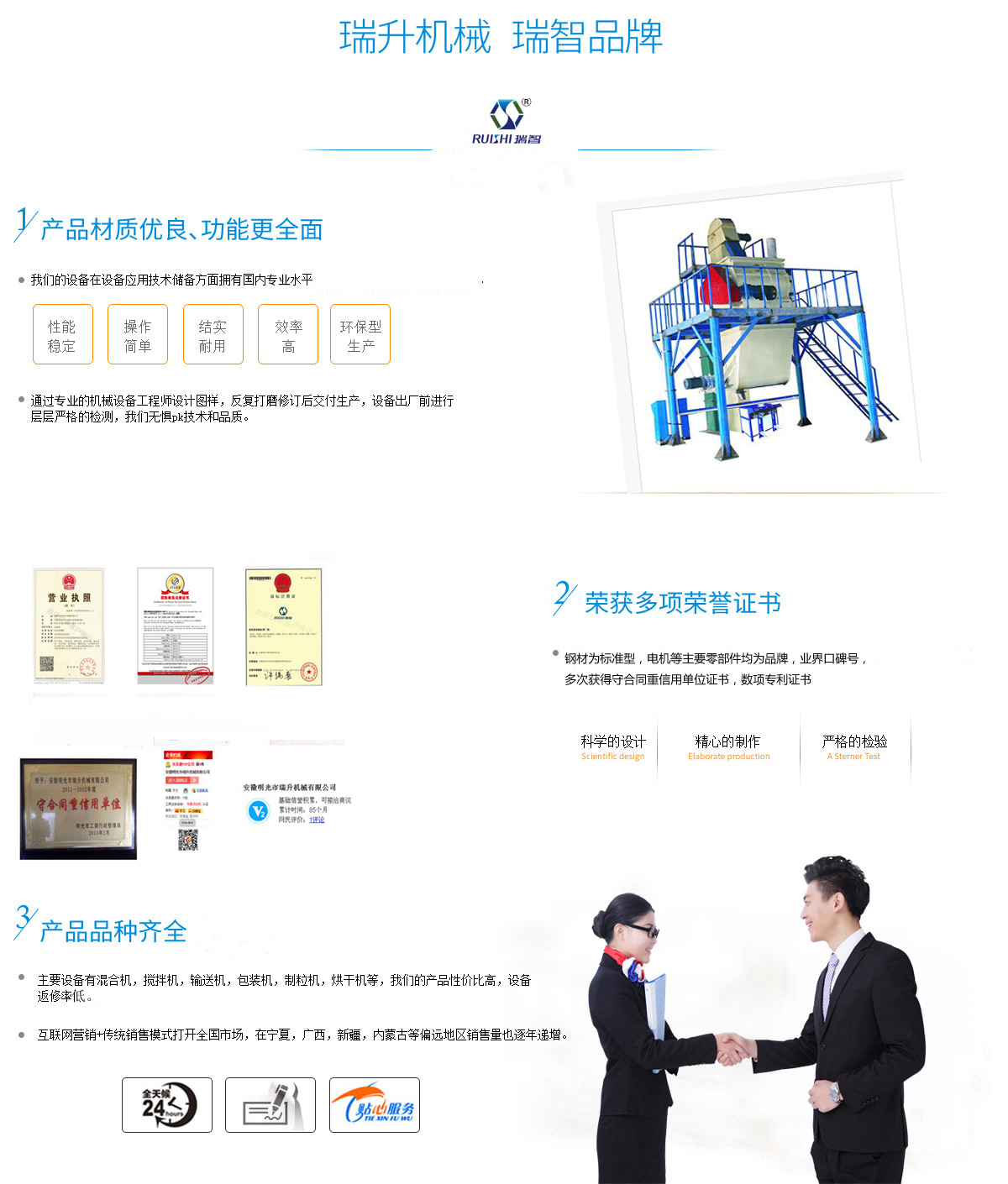 安徽瑞升機械制造有限公司坐落在明光市工業(yè)園區(qū),本公司產(chǎn)品主要用于粉料物質(zhì),顆粒物質(zhì)的混合、攪拌、輸送、包裝的自動化生產(chǎn)設(shè)備。工廠占地面積為1萬多平方現(xiàn)有6000平方米的生產(chǎn)車間和各類加工檢測設(shè)備,具備產(chǎn)品開發(fā)、研制、設(shè)計、生產(chǎn)、試驗、倉儲運輸?shù)饶芰Γ梢陨a(chǎn)多種規(guī)格、多種非標定制的產(chǎn)品,并有多項技術(shù)獲得國家專利,擁有自主進出口權(quán),公司憑借優(yōu)良的技術(shù)、先進的工藝和科學的管理理念,所生產(chǎn)的產(chǎn)品已暢銷全國各地,部分產(chǎn)品已進入馬耳他、印度尼西亞、韓國、羅馬尼亞、沙特阿拉伯、馬來西亞、印度、巴基斯坦、等國家和地區(qū),受到國內(nèi)外客戶的高度認可和信賴。 本公司獲得守合同重信用單位證書,對原材料的采購極為細致,鋼材為標準型,電機等主要零部件均為品牌,數(shù)項專利證書。技術(shù)方面我司擁有一支國內(nèi)的技術(shù)和管理團隊,在機械設(shè)備應用...公司資質(zhì)榮譽